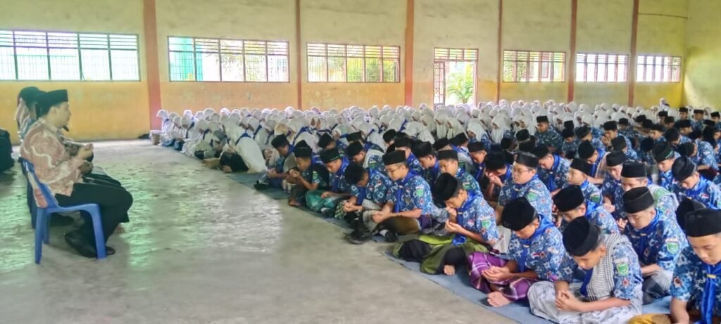 Suasana khidmat menyelimuti GOR MTsN 1 Medan pada Rabu (22/10) pagi. Madrasah Tsanawiyah Negeri (MTsN) 1 Medan menggelar kegiatan Zikir, Sholawat, dan Doa Bersama dalam rangka memperingati Hari Santri Nasional tahun 2025. Kegiatan ini dilaksanakan di dalam GOR madrasah mulai pukul 08.00 WIB, menyesuaikan dengan kondisi cuaca yang sedang hujan.